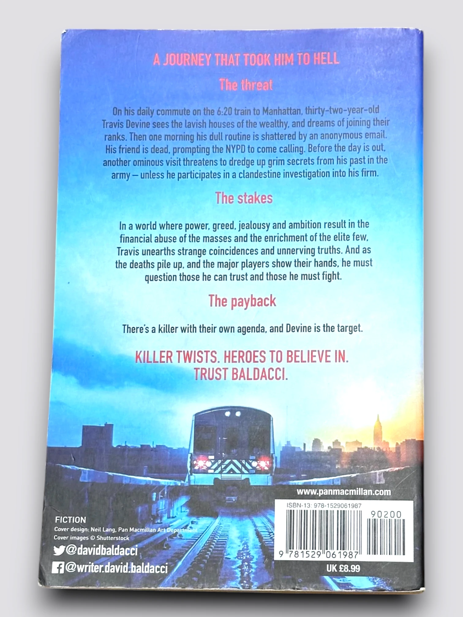 The 6:20 Man is a heart-racing thriller set in the world of high finance in New York, from the number one bestselling author David Baldacci. A journey that took him to hell . . . Having survived combat tours in Afghanistan and Iraq and been decorated with medals, Travis Devine leaves the army in mysterious circumstances, under a cloud of suspicion. And at thirty-two years old, he’s swapping fighting the Taliban and Al-Qaeda for a different kind of danger in the cut-throat world of high finance. His daily commute on the 6:20 a.m. train into New York’s financial district, to his new job as an analyst at the minted powerhouse investment bank Cowl and Comely, takes him into a world where greed, power, jealousy and ambition result in the financial abuse of the masses and the enrichment of an elite few. But it is on this daily journey that he passes a house where he sees something that sounds alarm signals he cannot ignore. A close friend of Devine’s, Sarah Ewes, is the first victim, and the mysterious circumstances surrounding her death at Cowl and Comely compel him to investigate further. As he digs deeper, he discovers strange coincidences and unnerving truths. As the deaths pile up, and the major players show their hands, he must question who he can trust – and who he must fight.