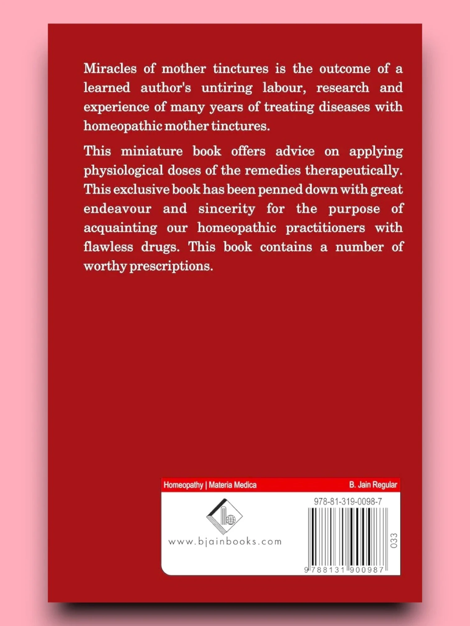 A complete Materia medica of Miracles of Mother Tinctures is the outcome of a learned author's untiring labor, research, and experience of many years of treating diseases with homeopathic mother tinctures. This miniature book offers advice on applying physiological doses of the remedies therapeutically. Remedies of prominent symptoms, the book deals with the symptoms, causes, medicines, and accessory means. A complete Materia medica of mother tinctures opened the doors to treatment by crude drug forms practiced by the author himself for many years. A very handy guide for practitioners acquainting them with the art of treatment by homeopathic mother tinctures.” This book contains a number of worthy prescriptions. This exclusive book has been penned down with great endeavor and sincerity for the purpose of acquainting our homeopathic practitioners with flawless drugs.